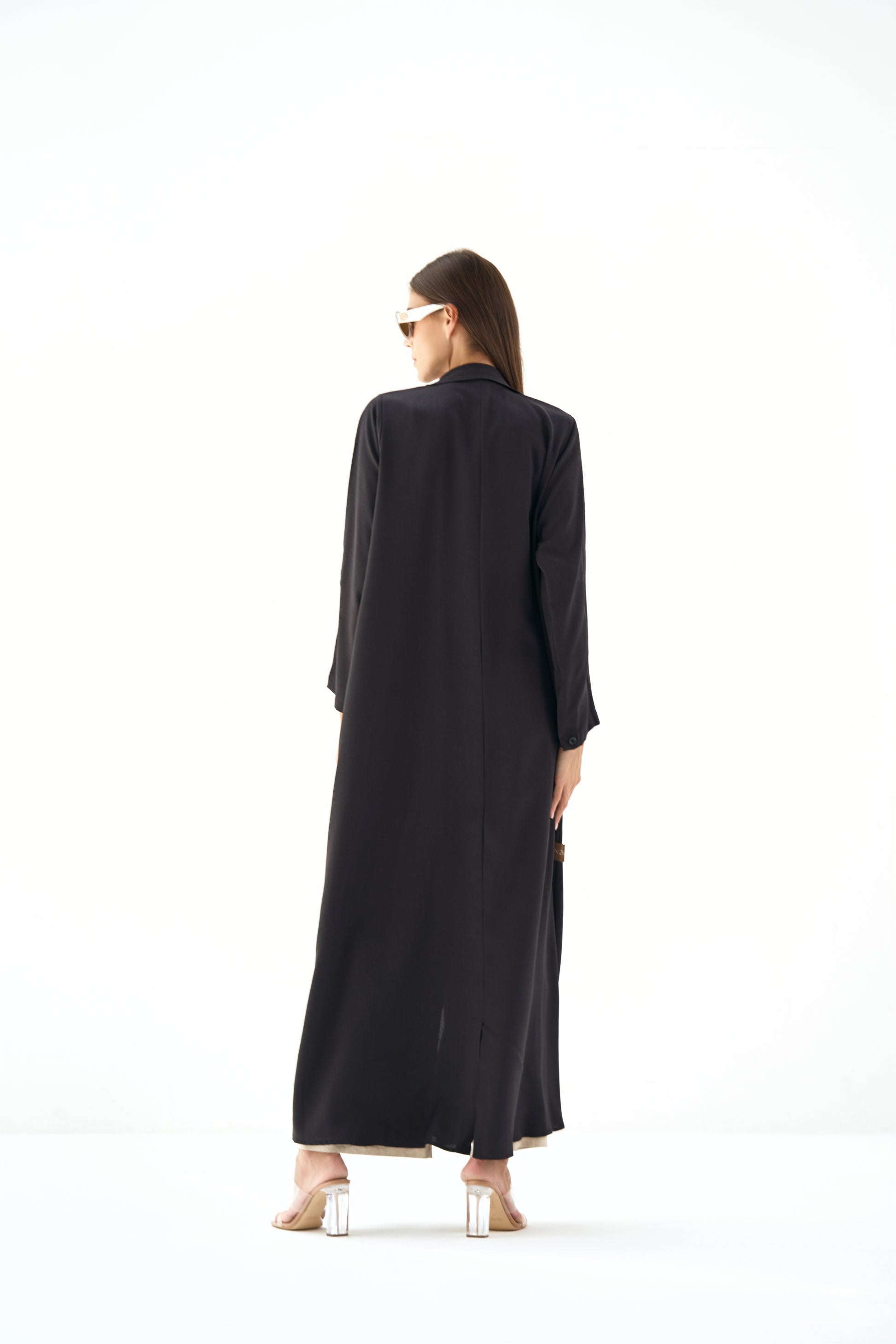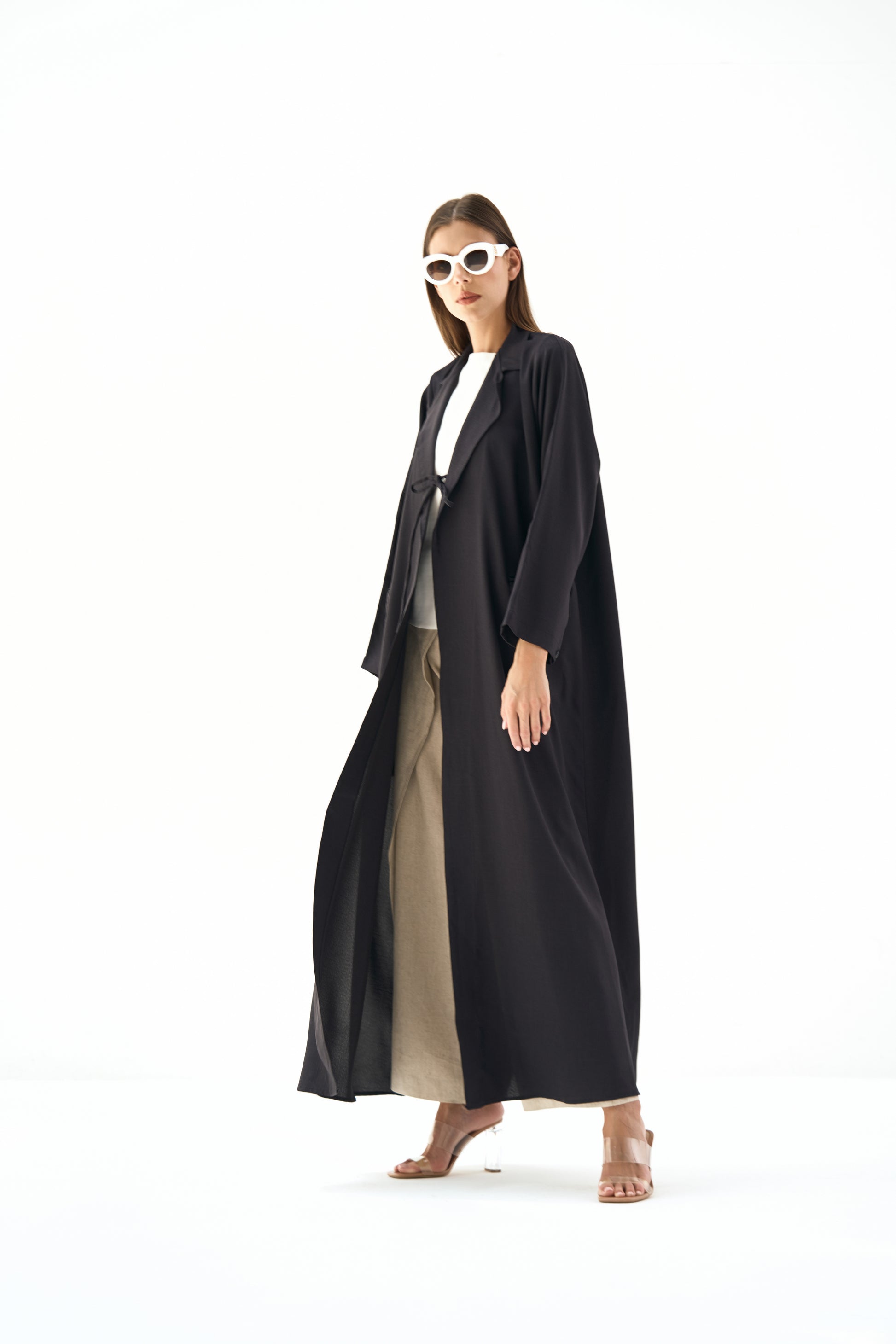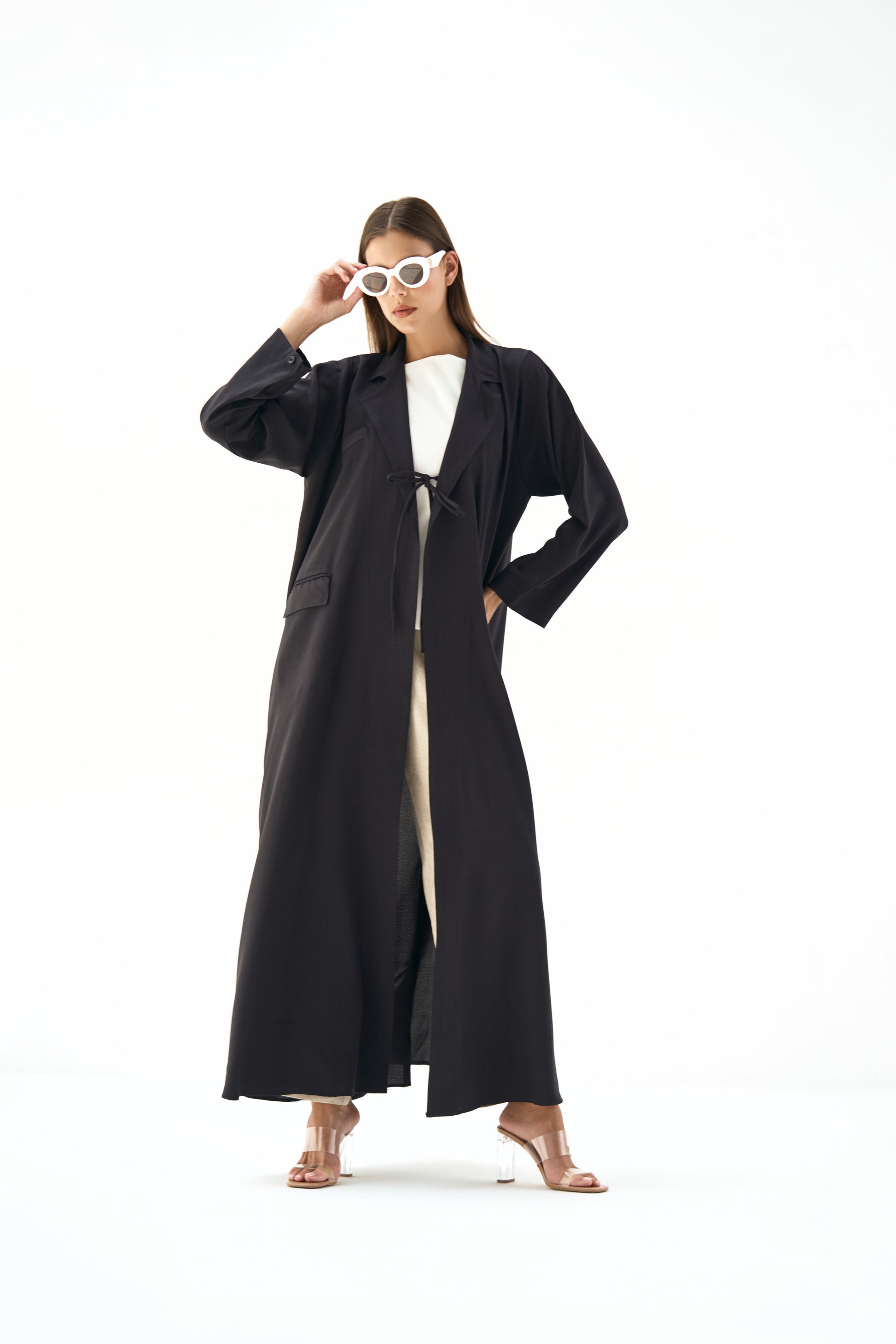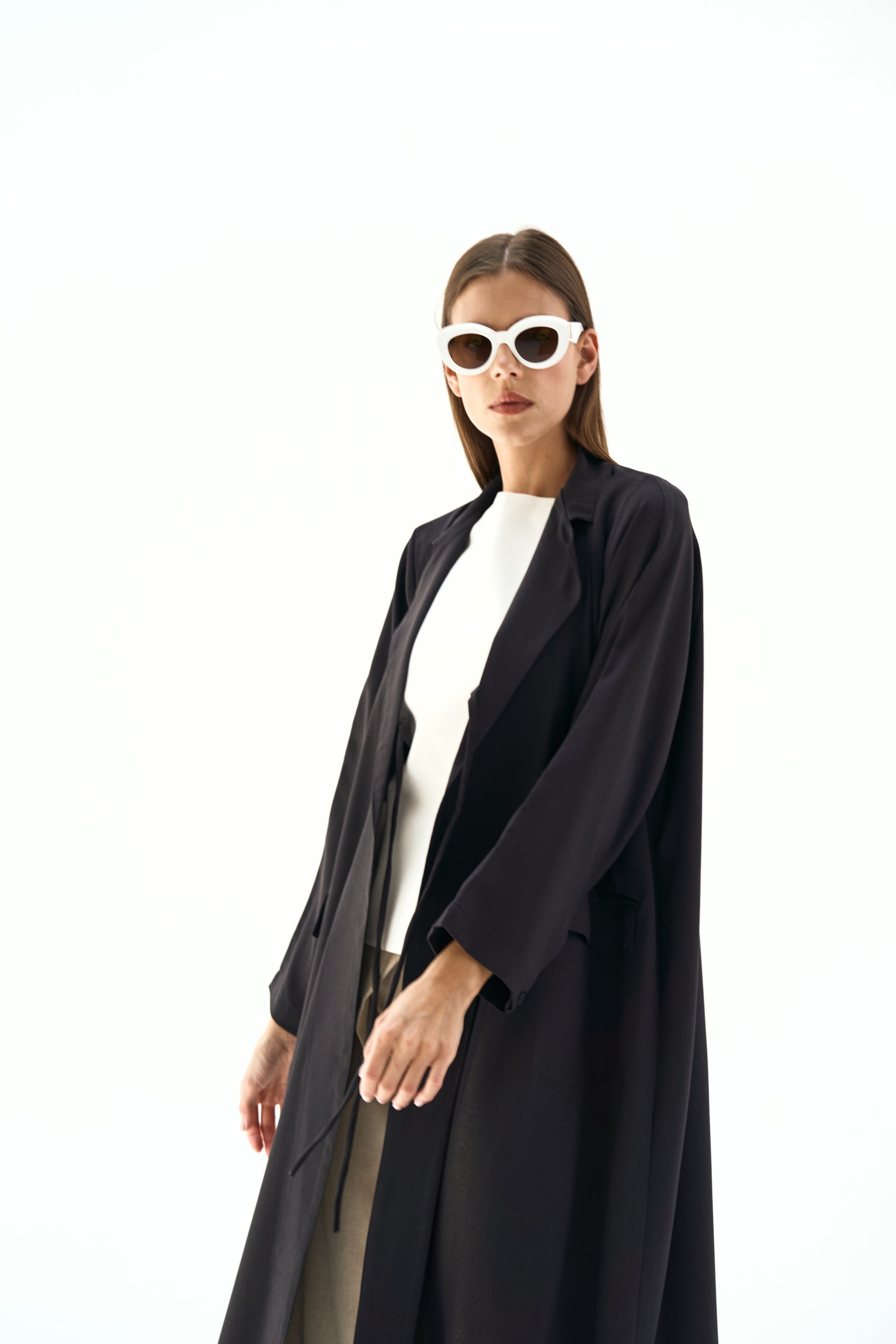 Featuring a straight silhouette, classic collar, flap pockets, adjustable strings that can be tied as a bow, and a back vent.