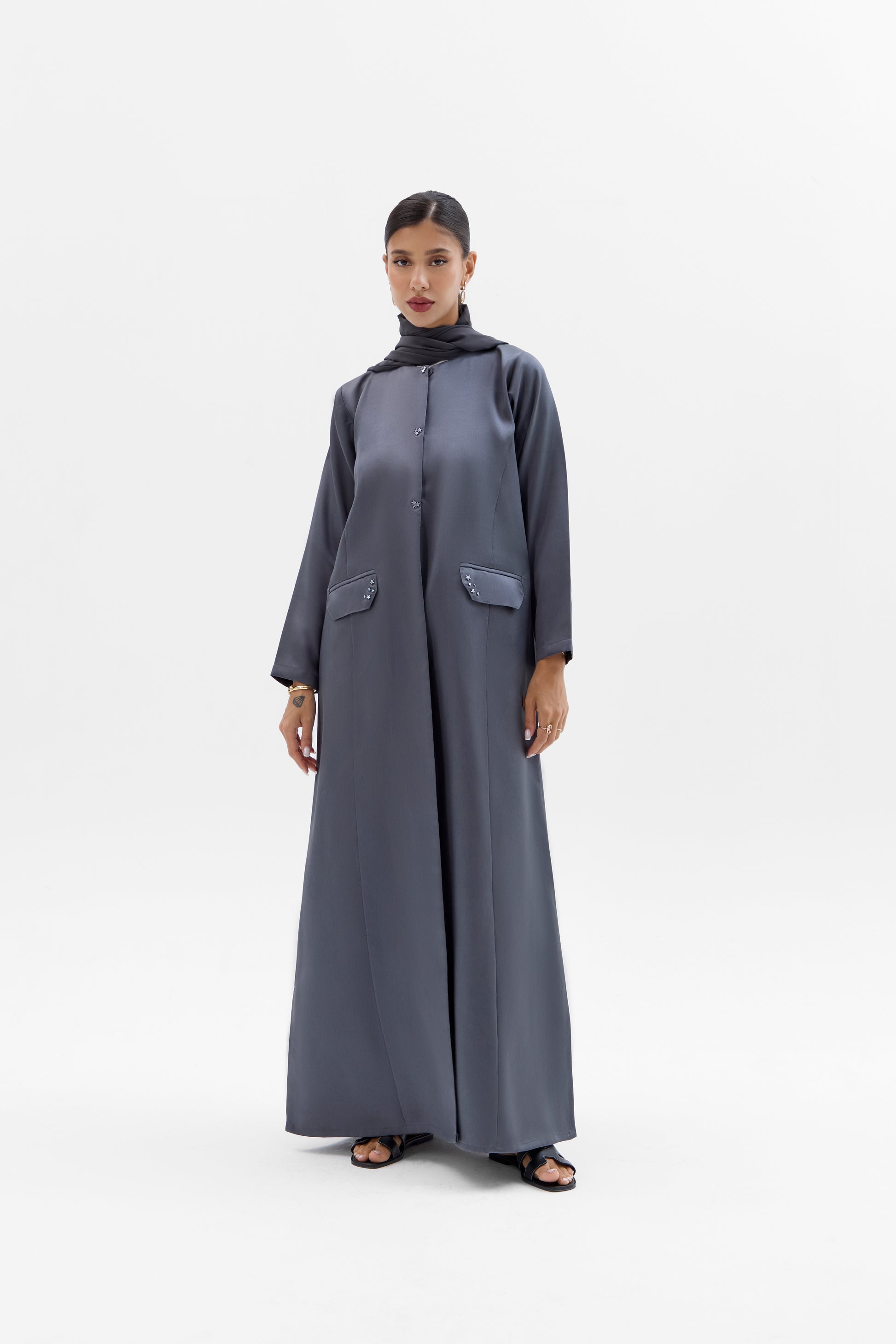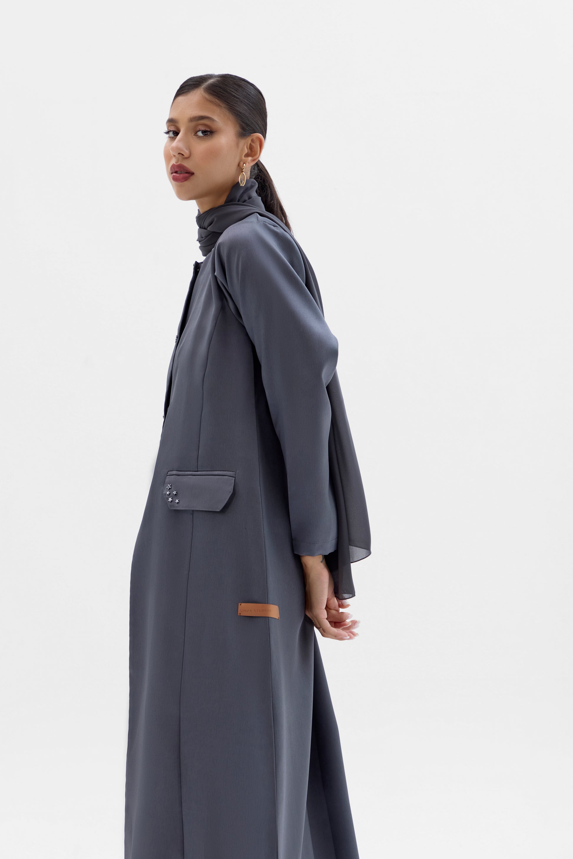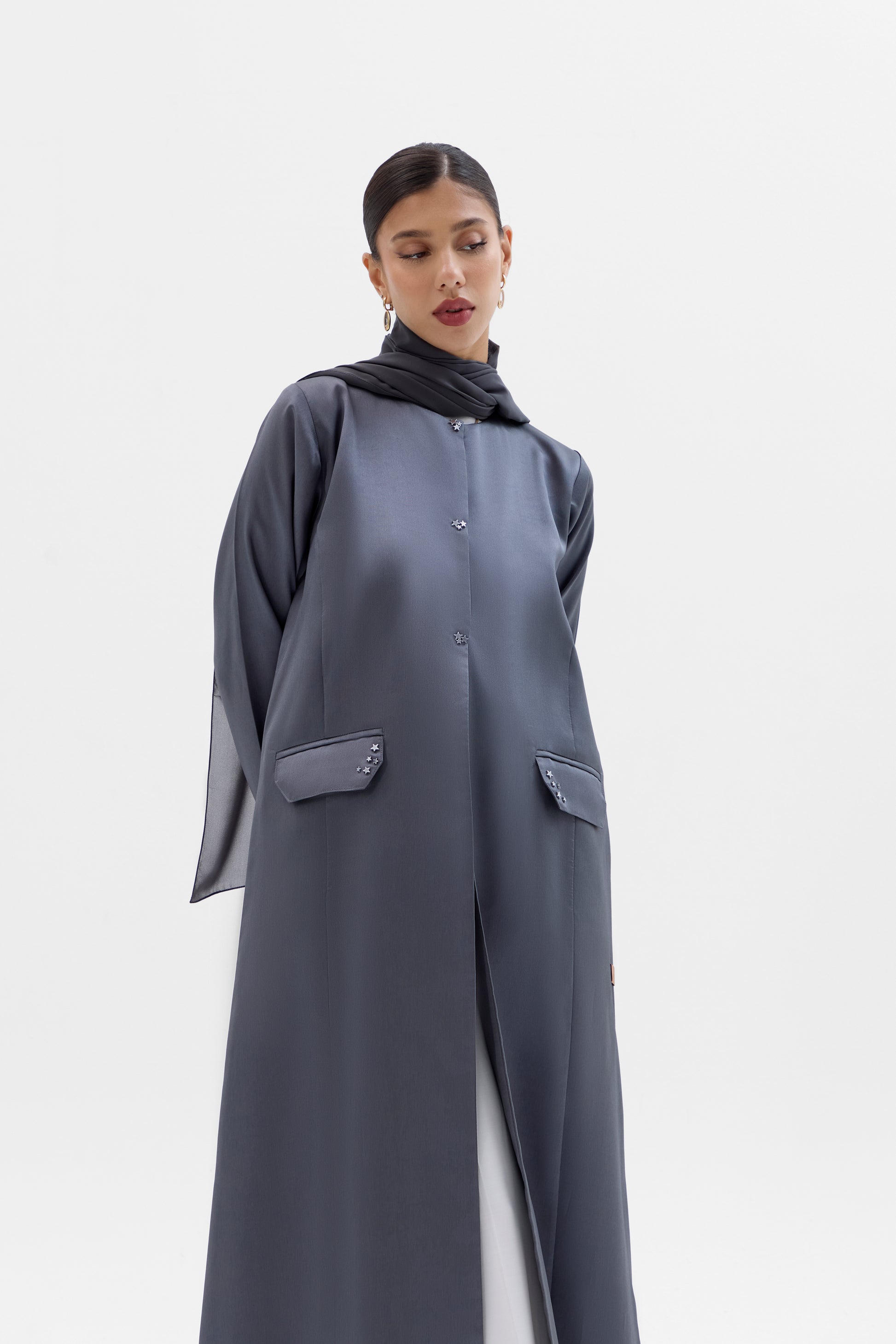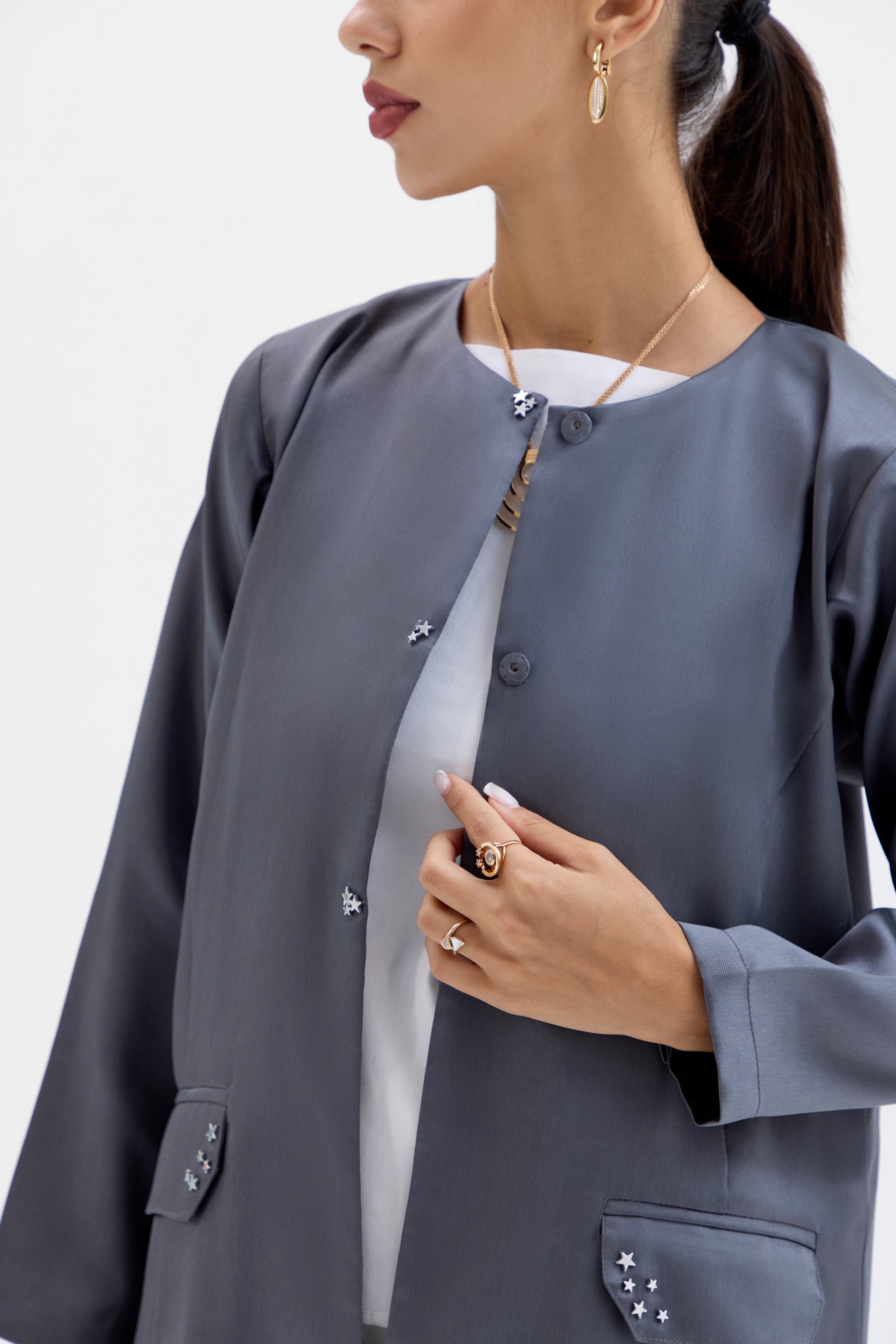 Crafted from premium taffeta, this piece showcases a sophisticated straight silhouette with a round neckline embellished with stars at the front and secured with snap buttons. The flap pockets feature a unique star alignment, adding an inspirational touch to the design.
