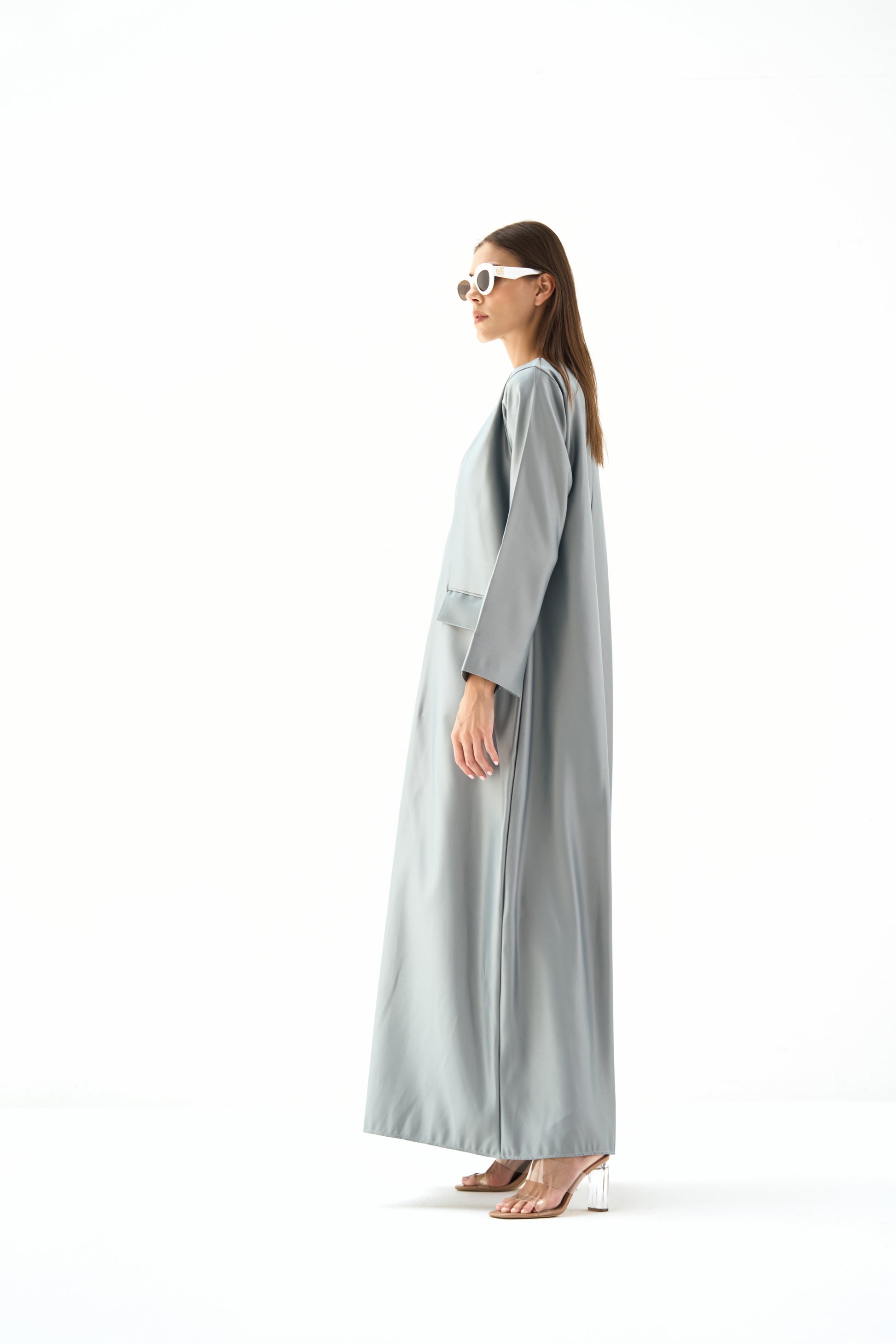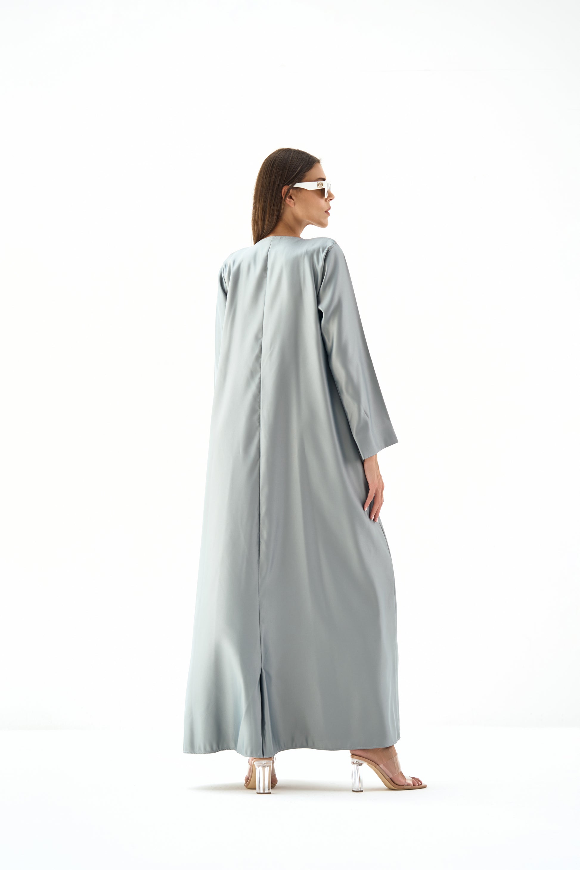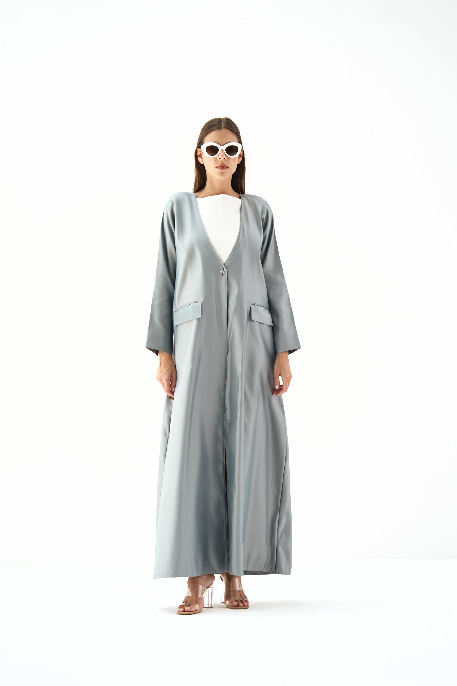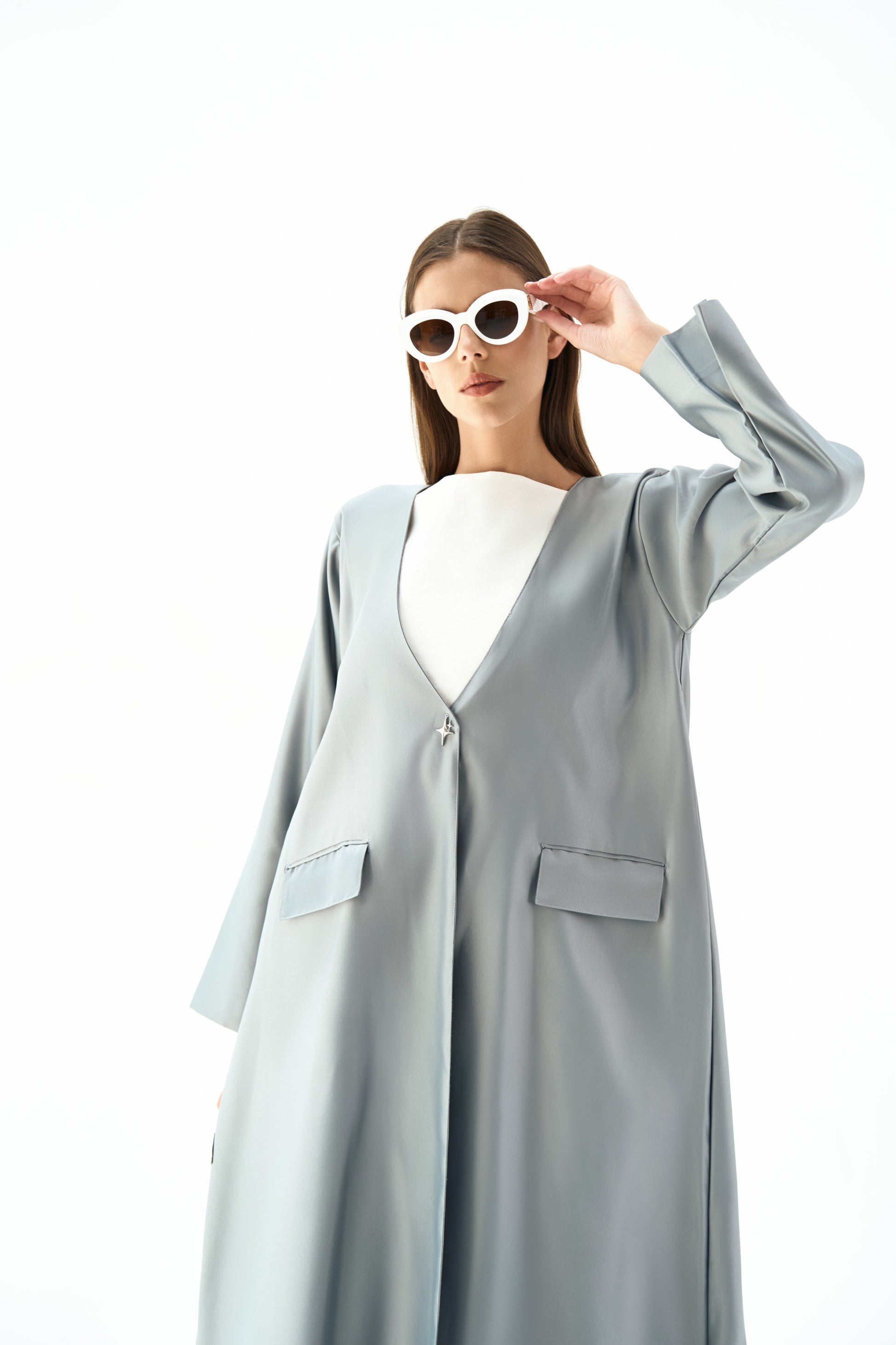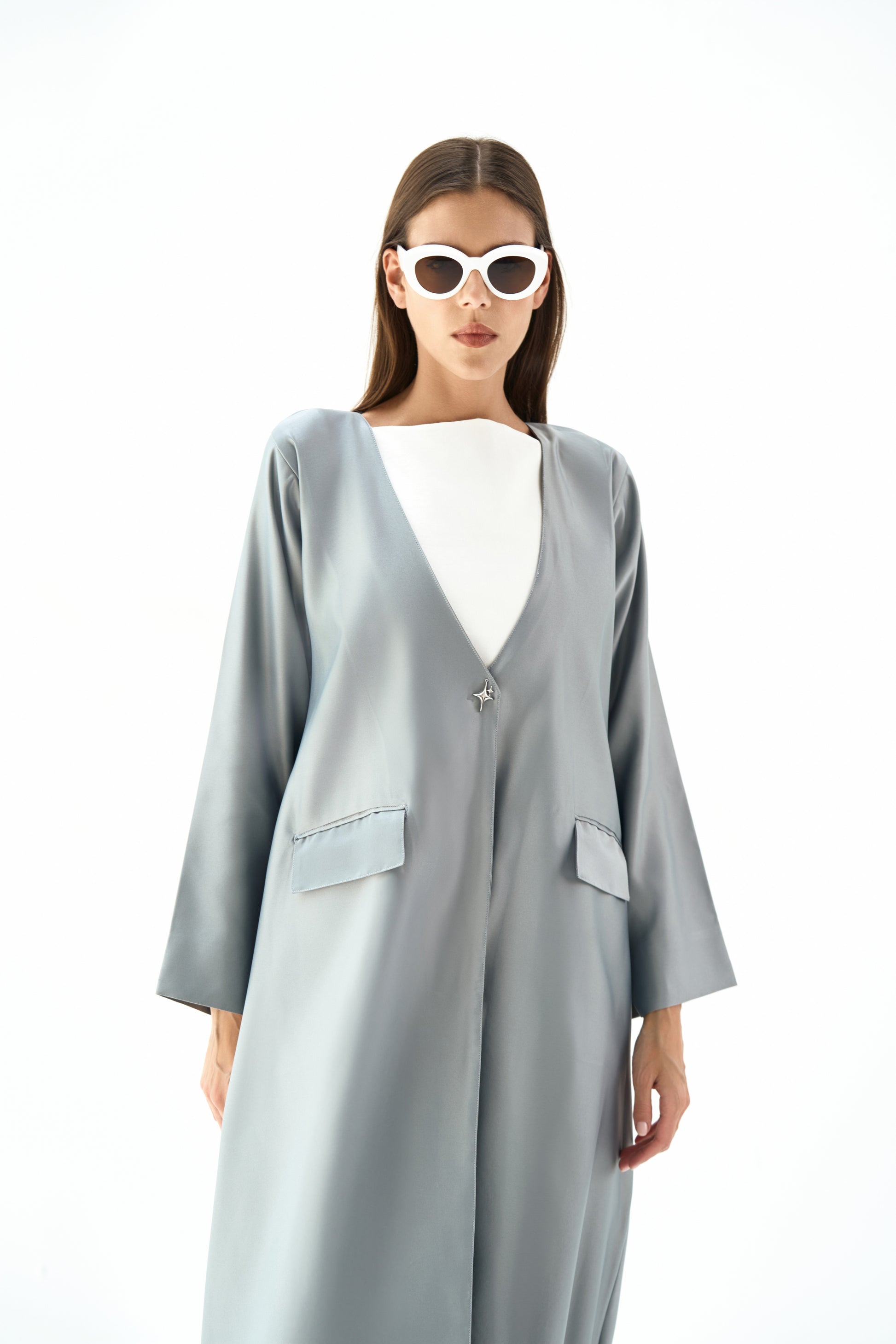 Embrace luxury in our satin coat silhouette, featuring a statement round deep neckline, flap pockets, chic sleeve slits, a sophisticated back vent, and a captivating single spark charm for an exquisite finishing touch.