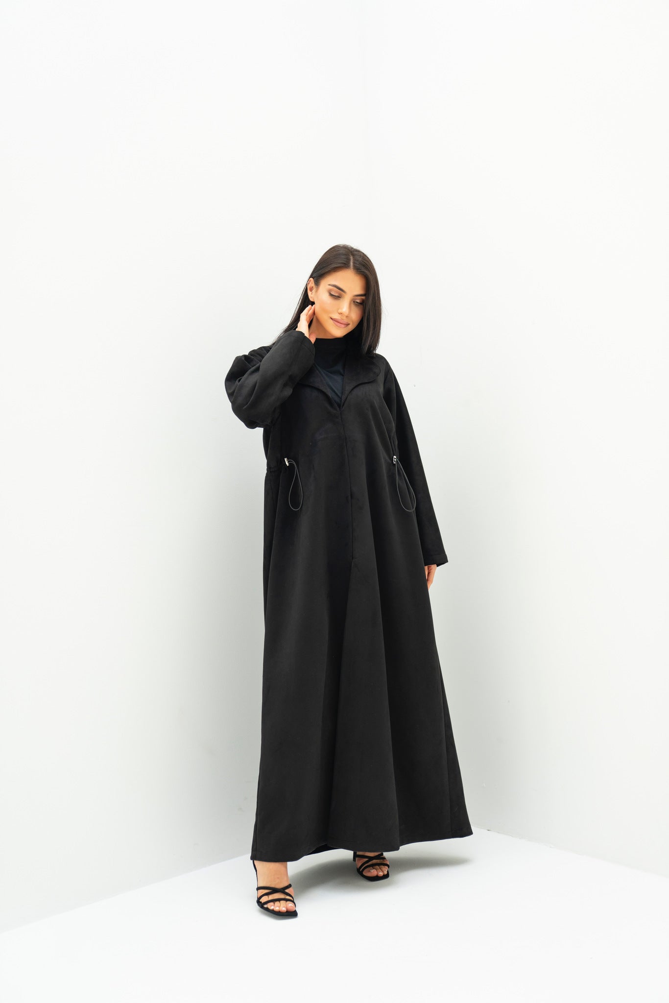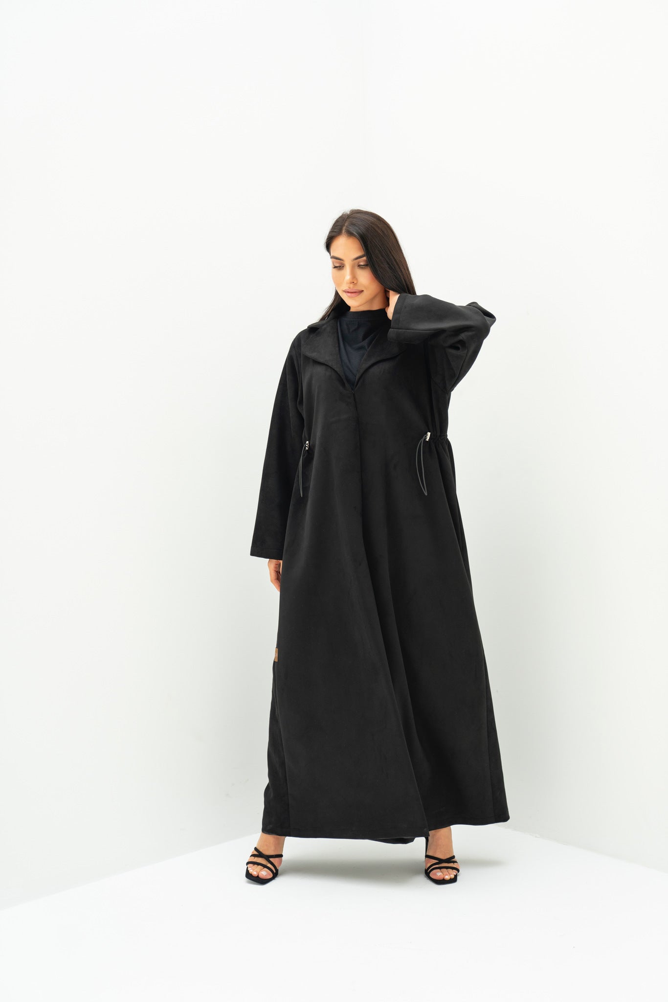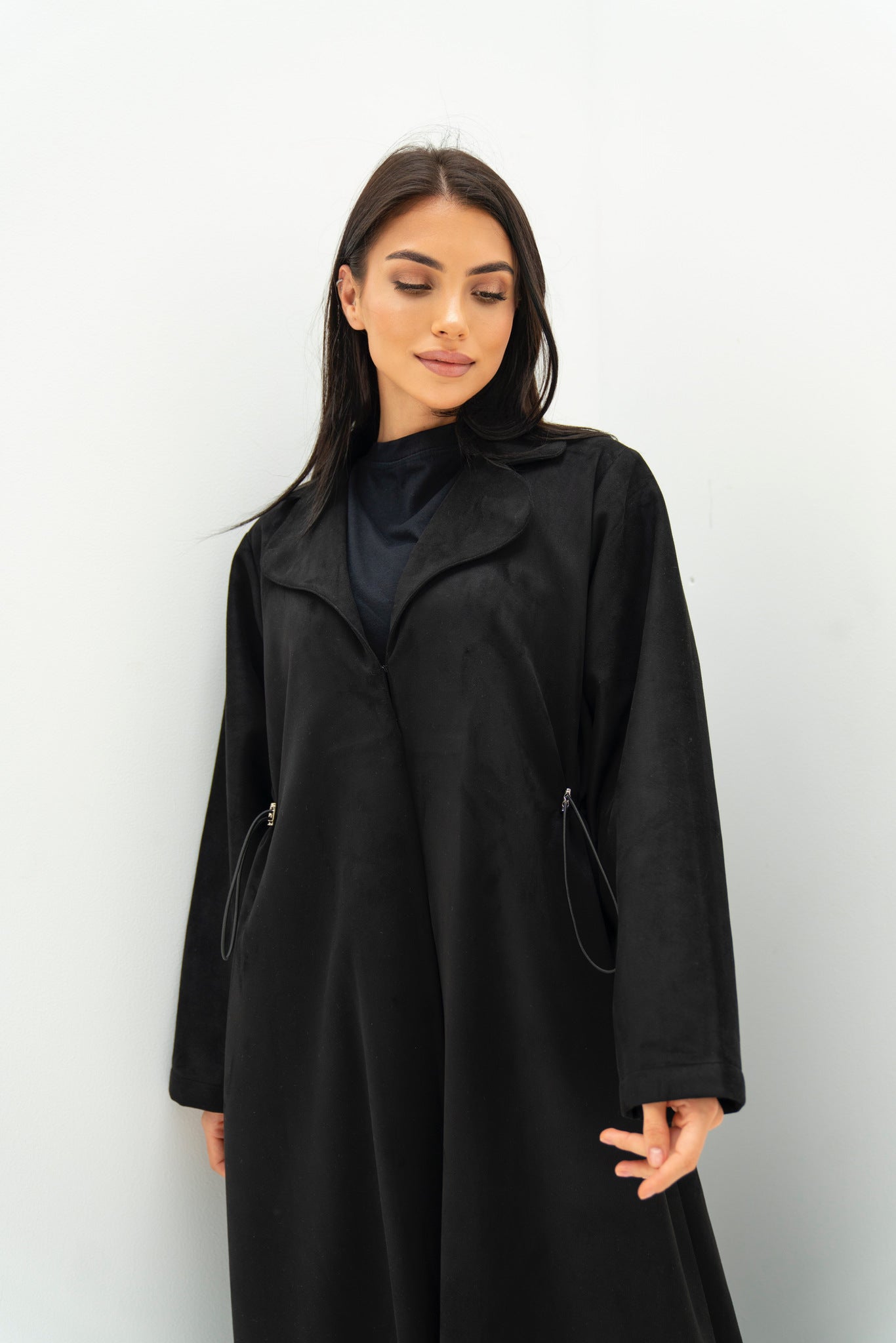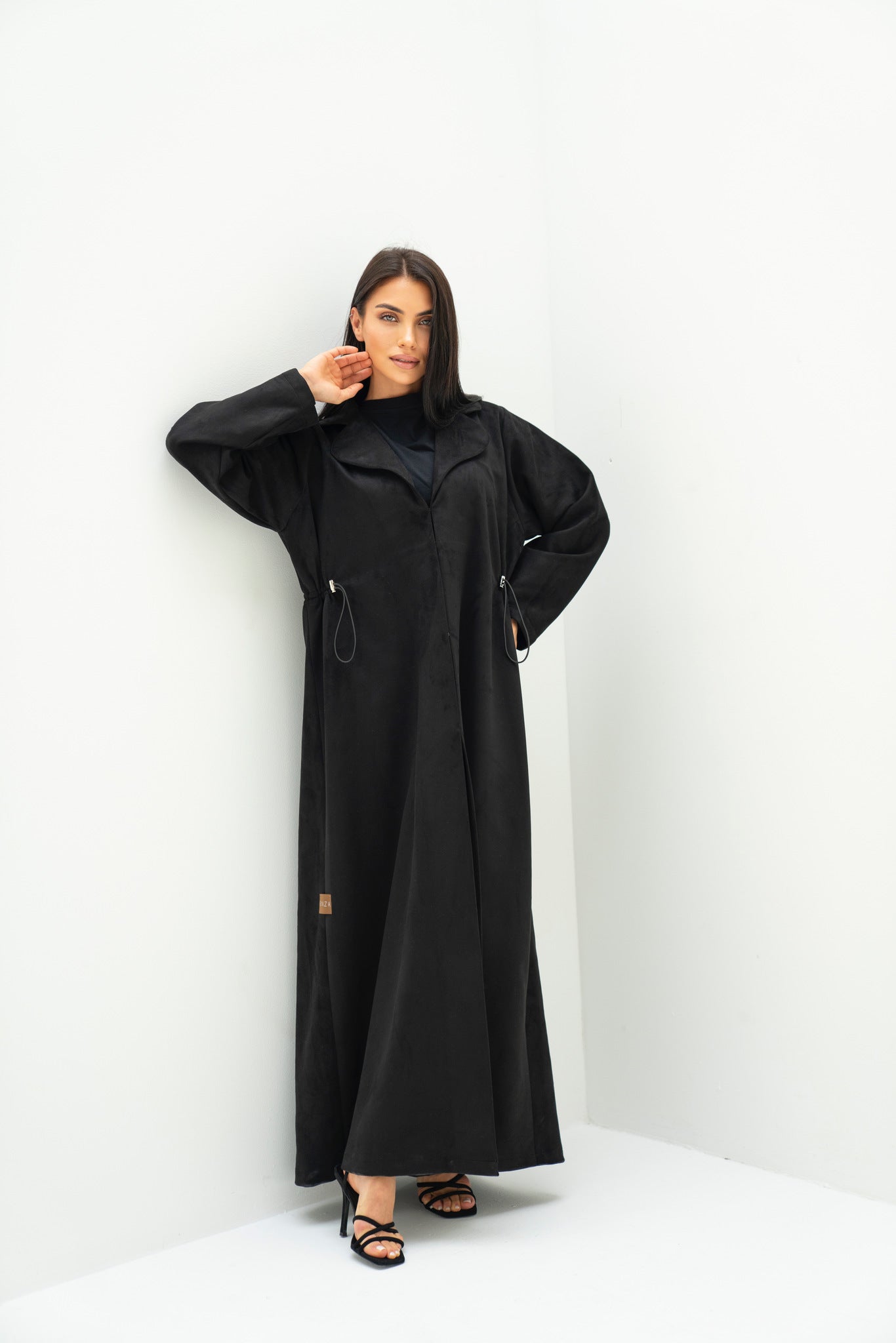 tailored from luxurious suede with a figure-flattering adjustable drawstring at the waist for a customizable fit.